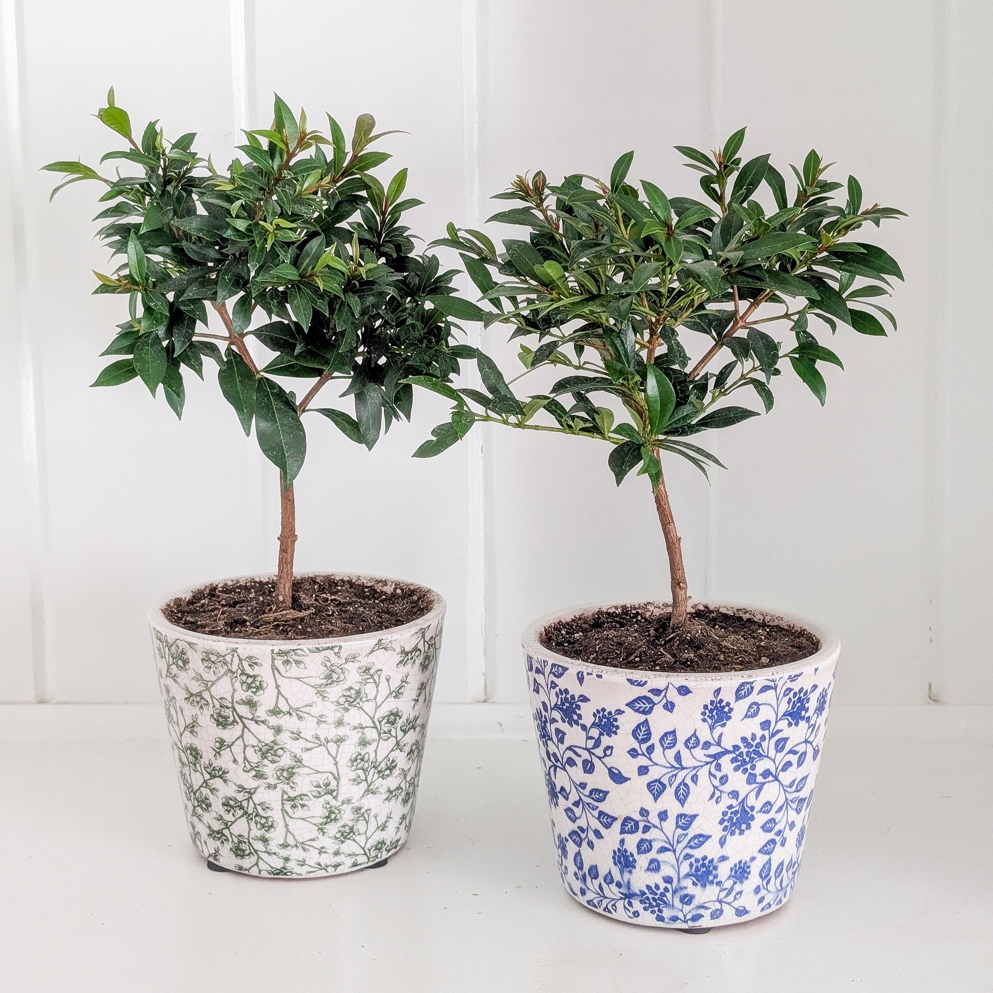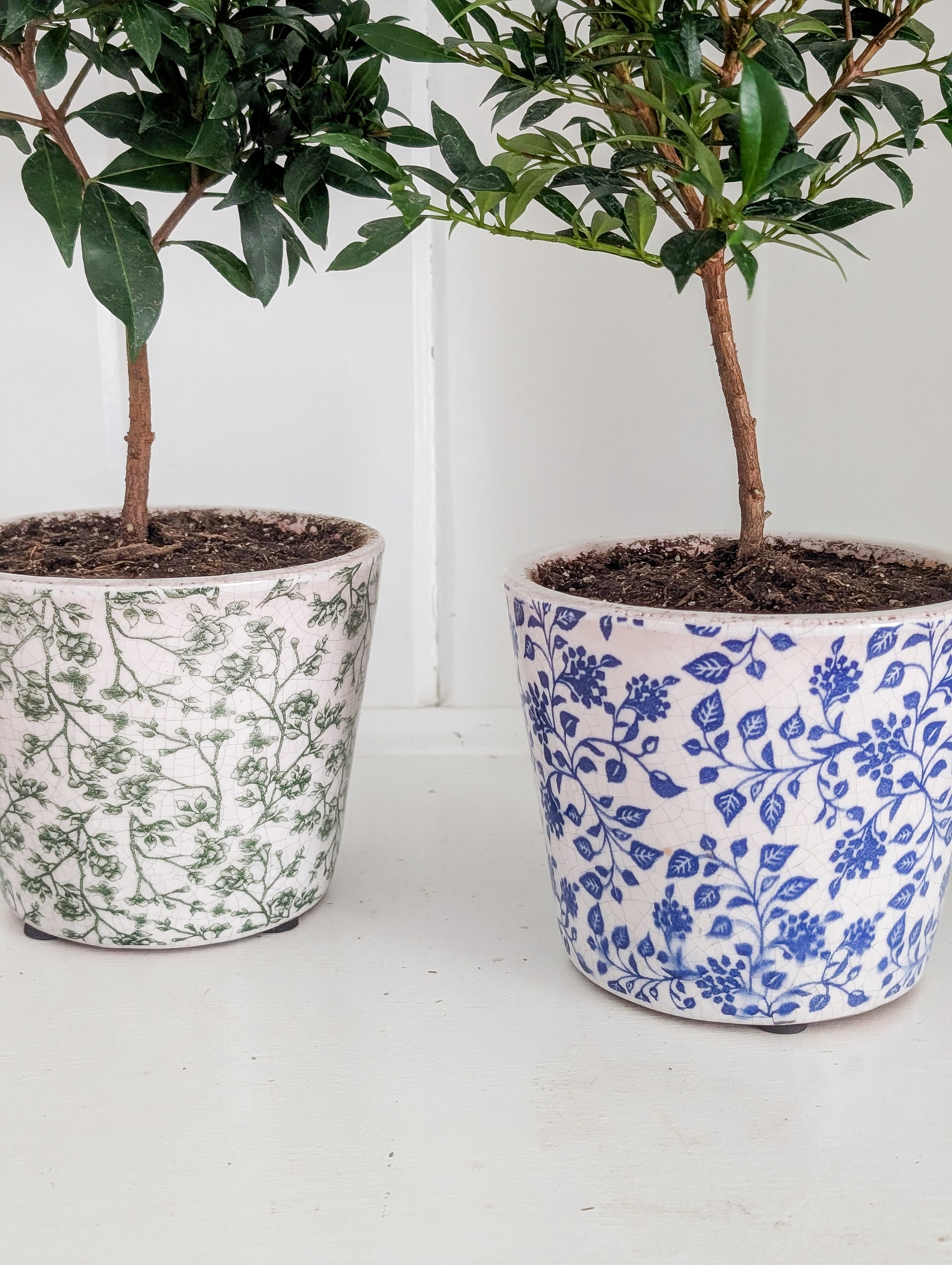 Freshly potted into 5" ceramic floral pot.
