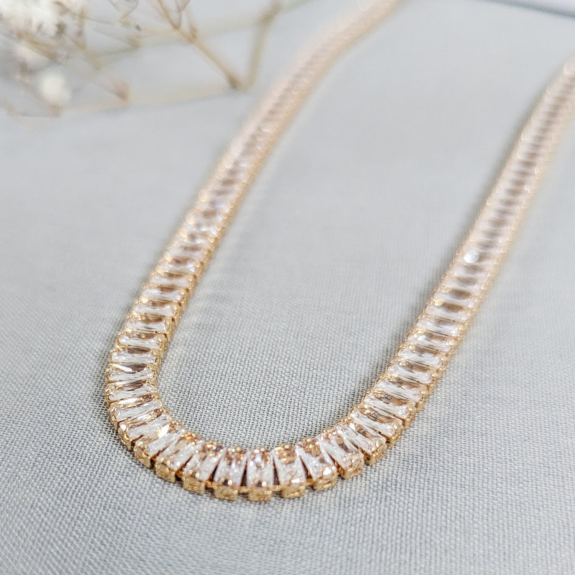 Make a bold statement with our heavy-weight faux diamond and faux gold-plated necklace. This stunning piece features eye-catching faux diamonds that sparkle brilliantly, set against a luxurious gold-plated backdrop that adds an elegant touch.