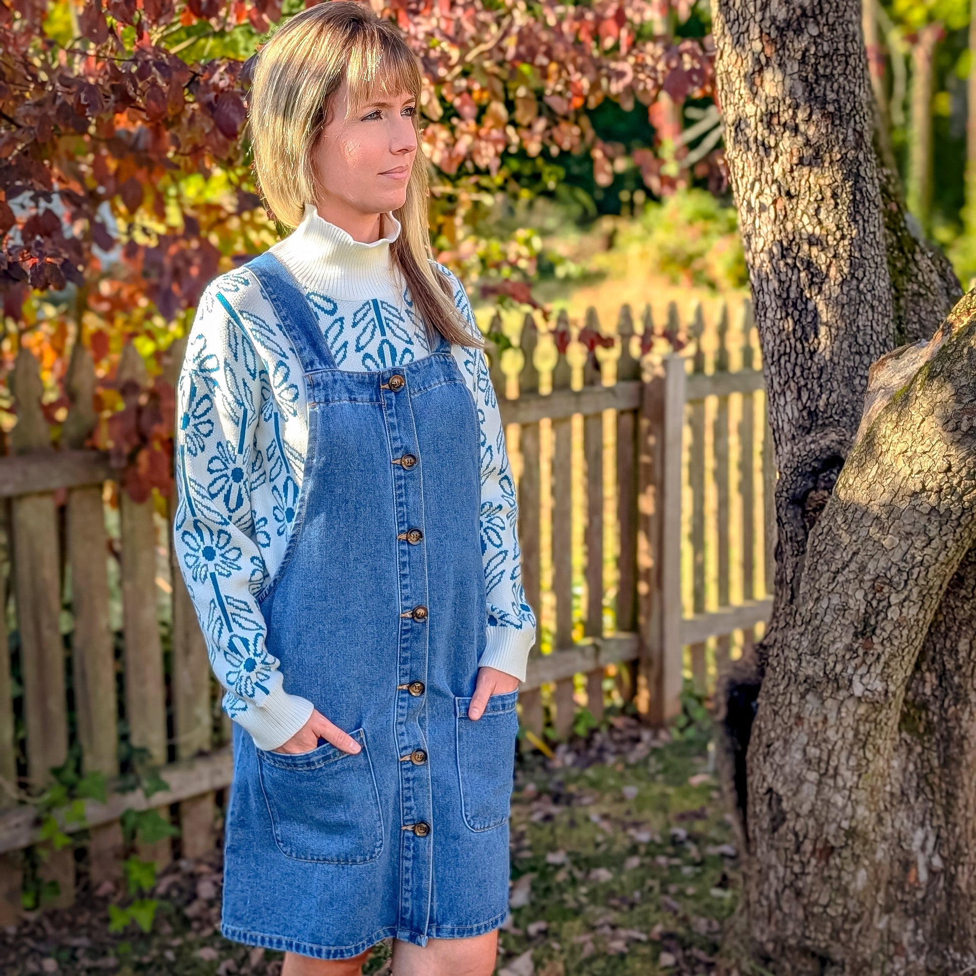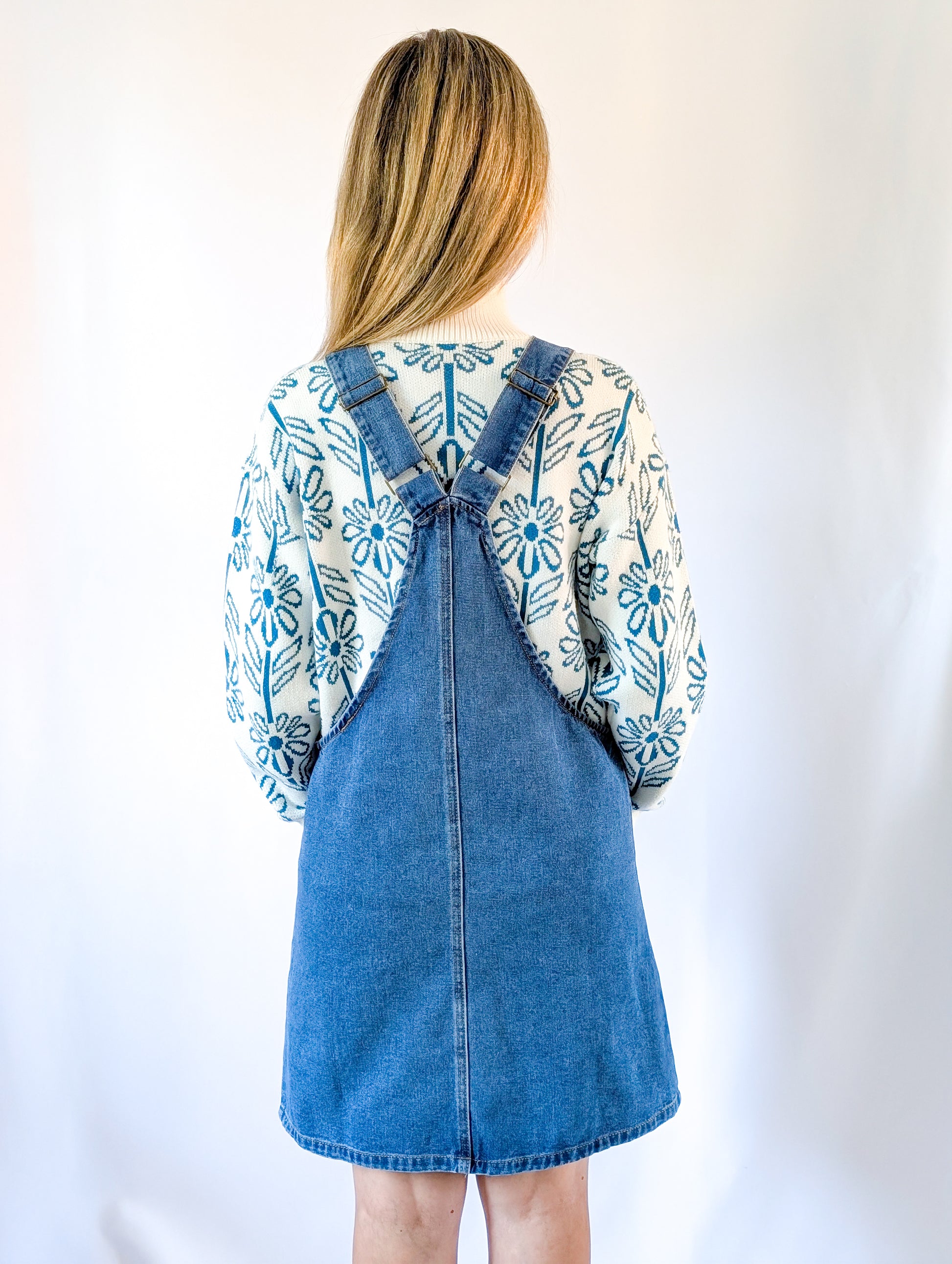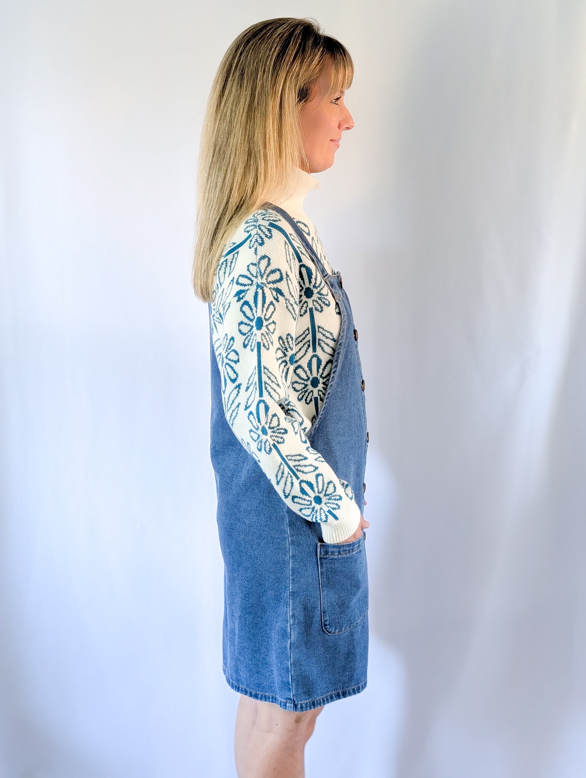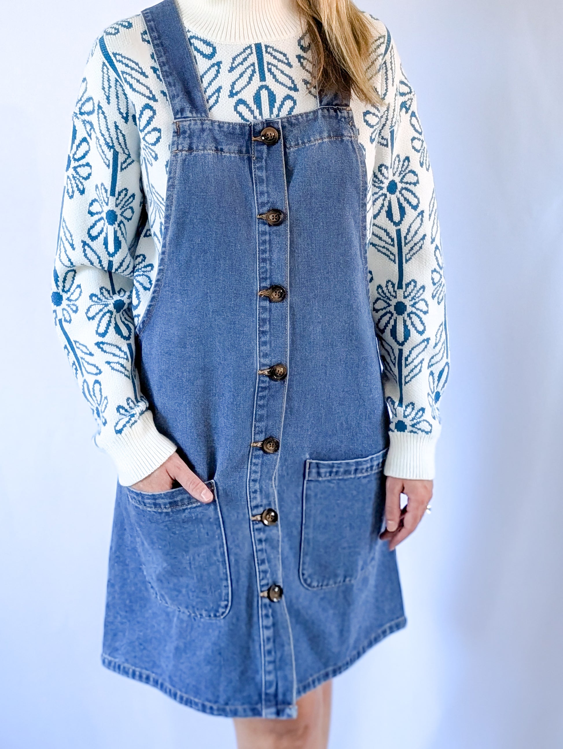 Embrace the season with our stylish jean overall, designed for both comfort and versatility in fall and winter. This classic piece features warm denim that keeps you cozy, while the charming brown button-down details add a trendy touch to your outfit.