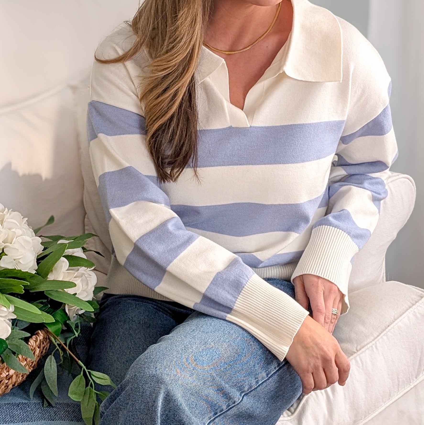 Channel timeless preppy charm with our blue and white rugby collar sweater, a standout piece in the New England Weekend Collection. Crafted from ultra-soft fabric for unmatched comfort, this sweater features bold stripes and a classic rugby collar that exude effortless sophistication. Perfect for crisp coastal mornings or cozying up après-ski, it pairs beautifully with denim or layered over a collared shirt. Embrace the spirit of New England living with a sweater that’s as versatile as your weekend plans.