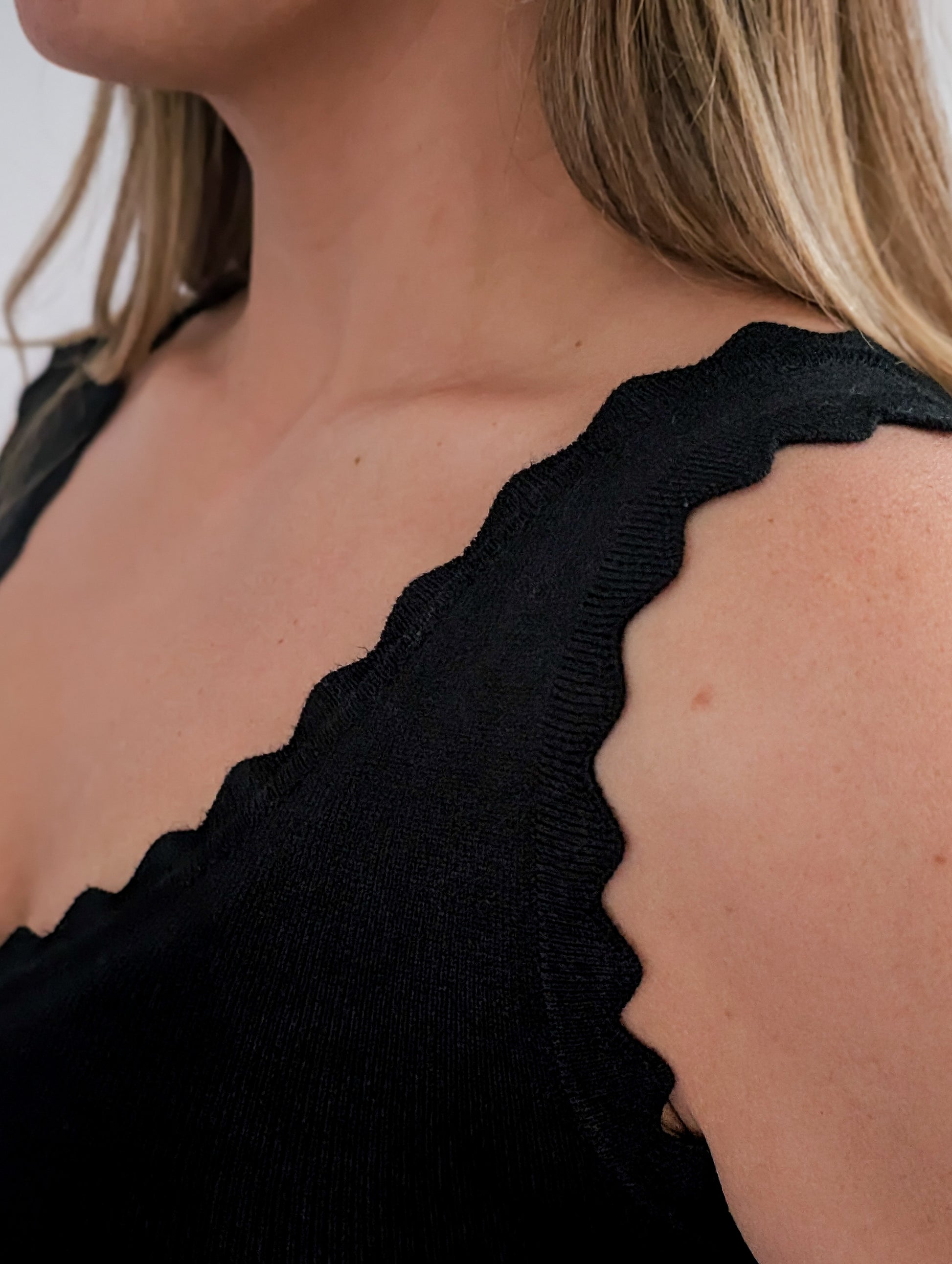 This scalloped-edge cropped sweater tank top is the perfect blend of sweet and chic. Featuring a soft knit design, it offers a comfortable yet flattering fit, while the delicate scalloped edges add a feminine touch. The cropped length makes it a versatile piece for layering or wearing on its own, perfect for pairing with high-waisted jeans, skirts, or shorts for an effortlessly stylish look.