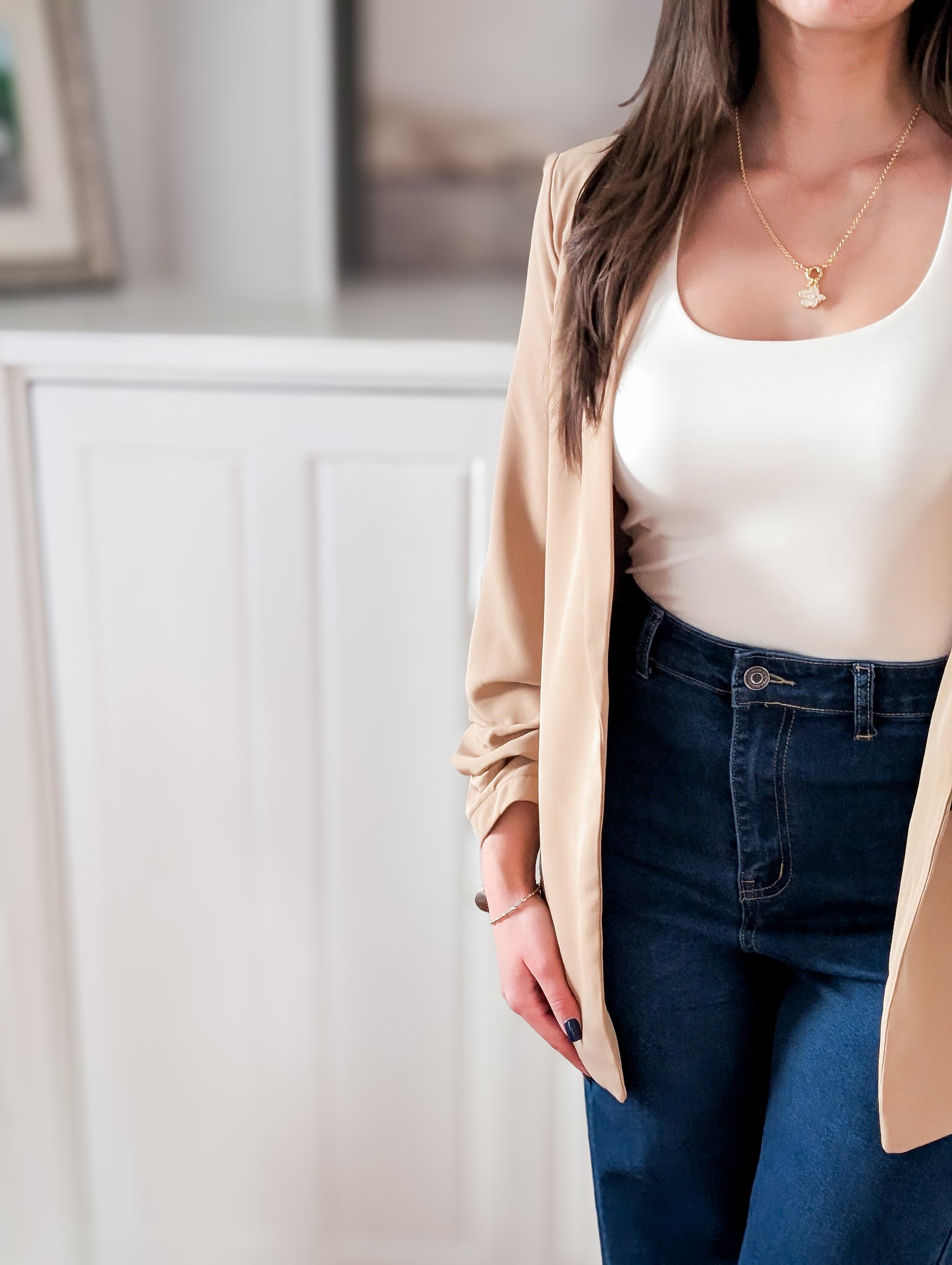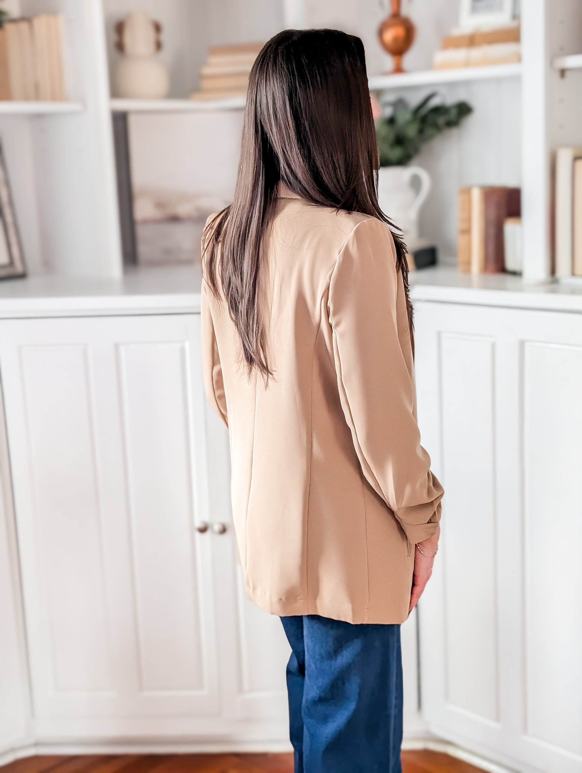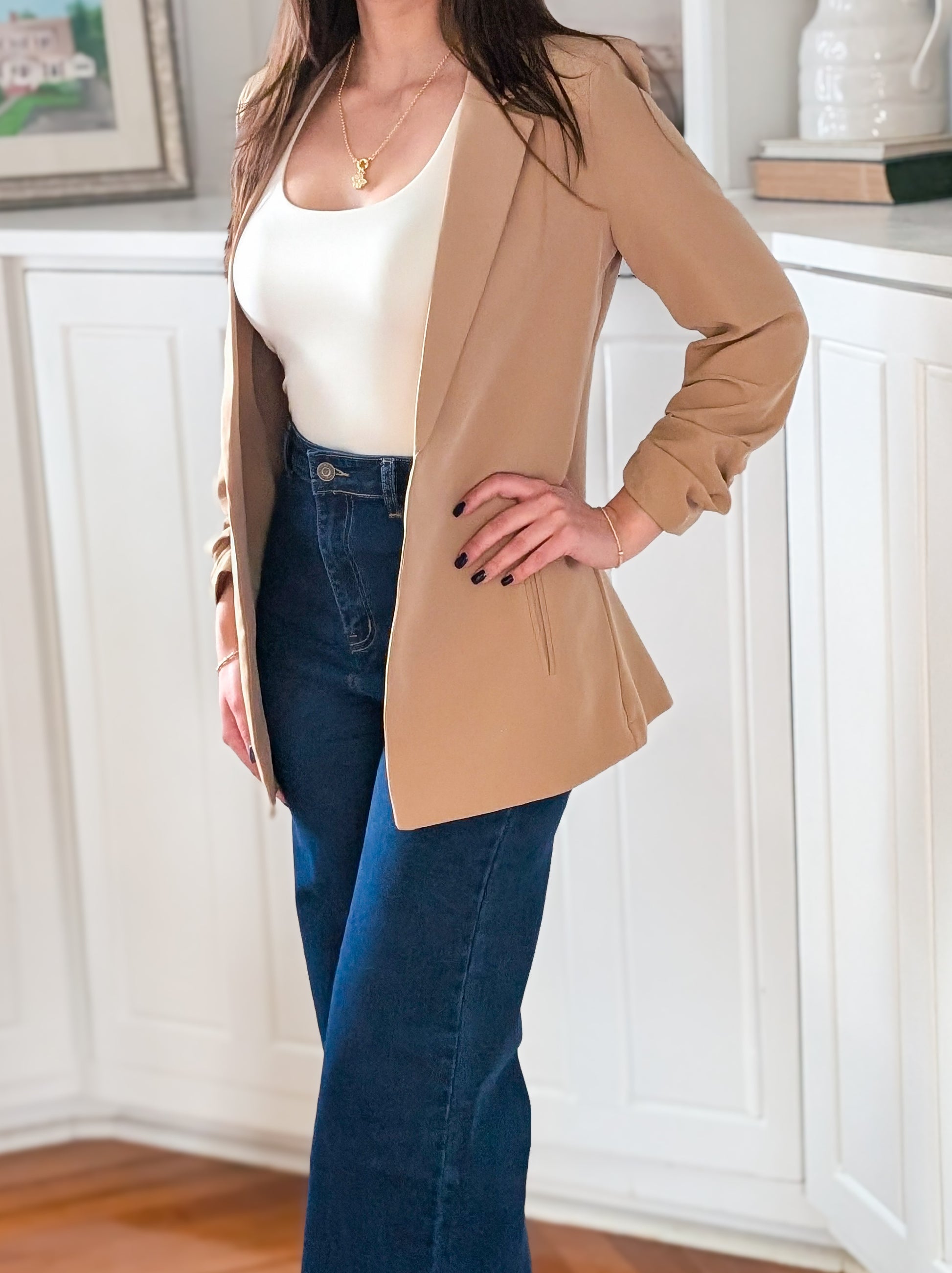 Elevate your wardrobe with our fitted tan blazer, a timeless piece that seamlessly combines sophistication and style. This tailored jacket features open front, adding a touch of relaxation to this classic design. The scrunched sleeves enhance the aesthetic for work and play.