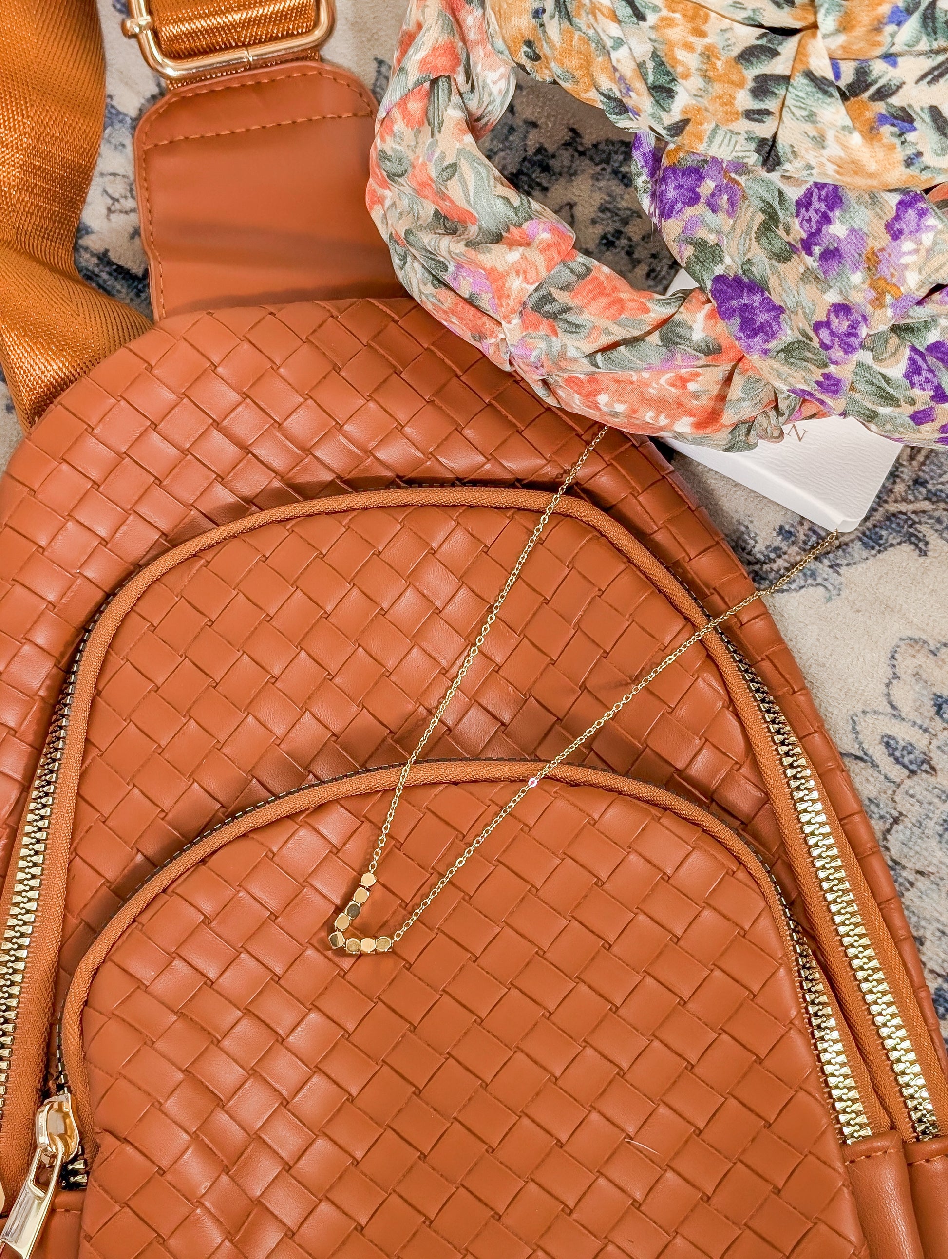 For work or play with this versatile crossbody bag. Beautiful gold details, silk strap, and vegan Weaved leather - you can't go wrong!