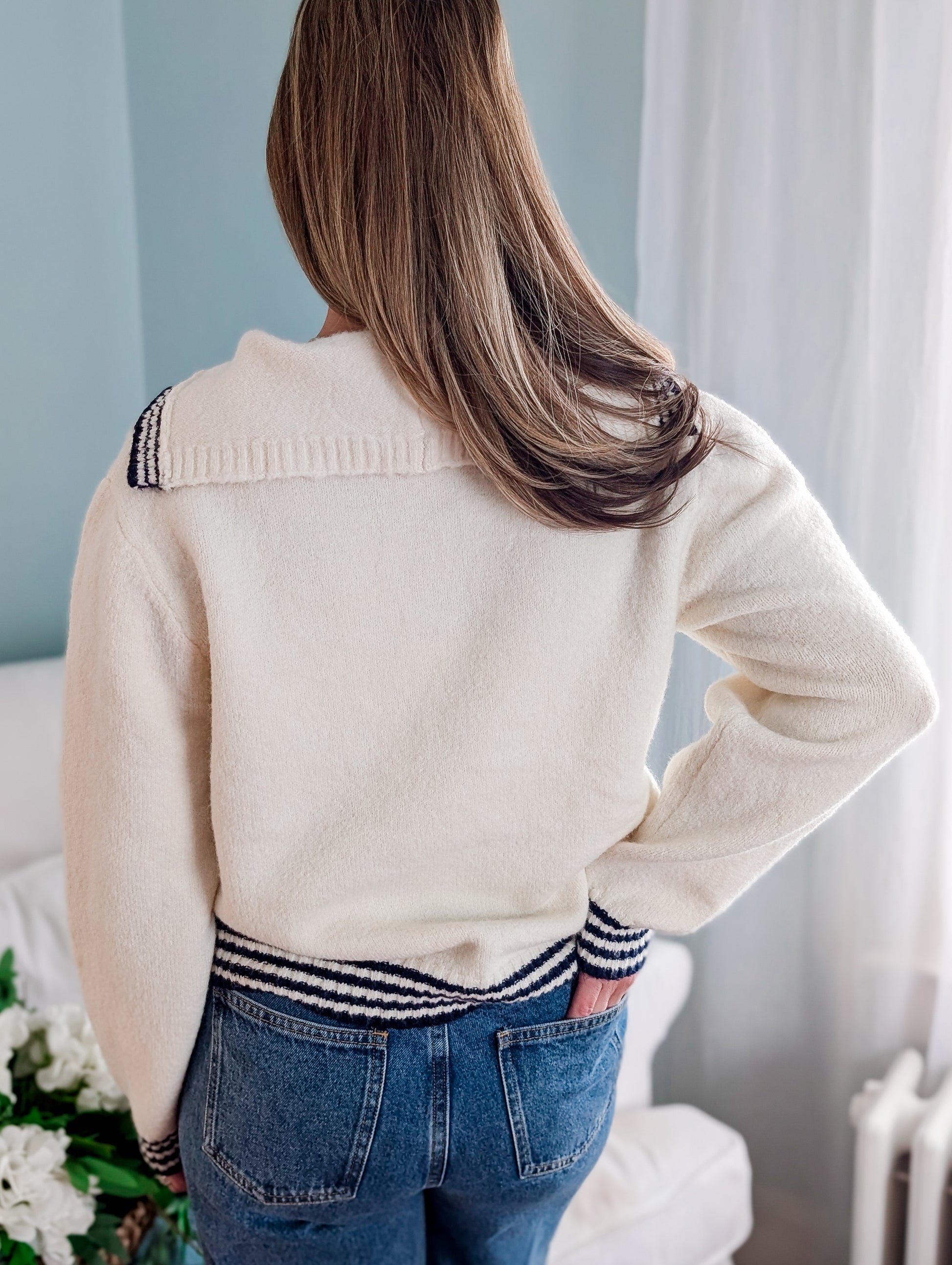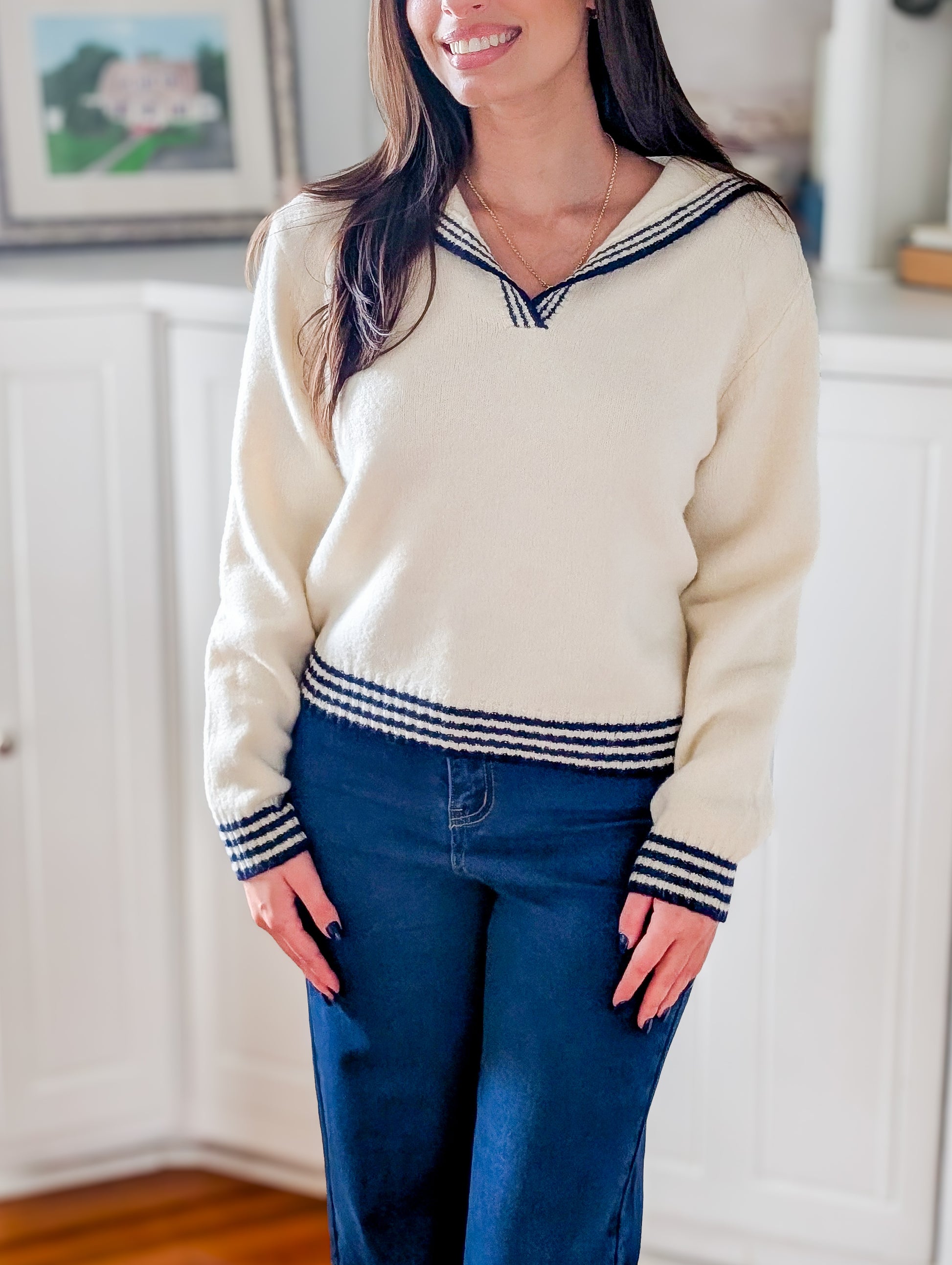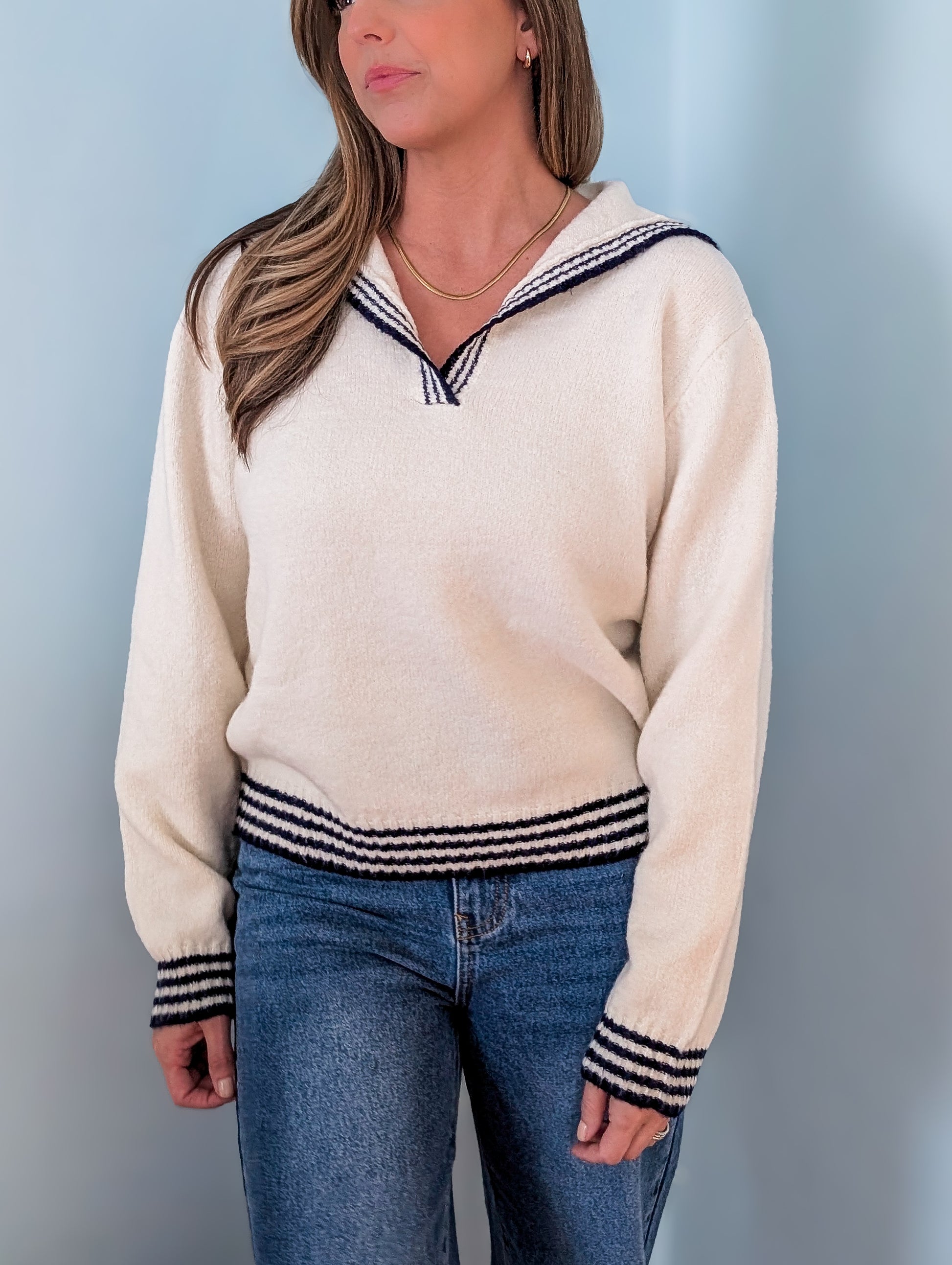 Timelessly nautical and irresistibly cozy, this navy-bordered sailor sweater is a wardrobe staple. Crafted in ultra-soft knit with cream accents, it’s the perfect companion for breezy New England weekends. With its classic design and effortless style, this sweater pairs beautifully with jeans for a casual coastal stroll or layered over a dress for fireside evenings. Embrace the charm of seaside living with a sweater made for comfort and adventure.
