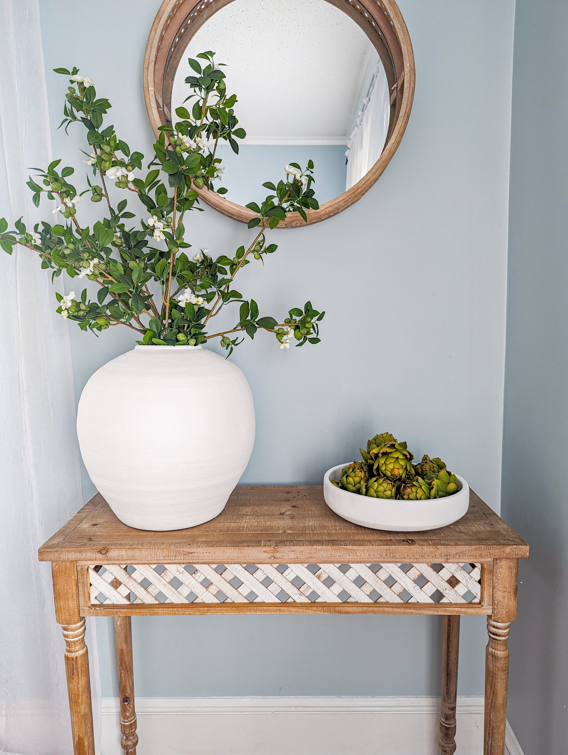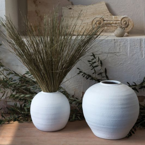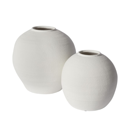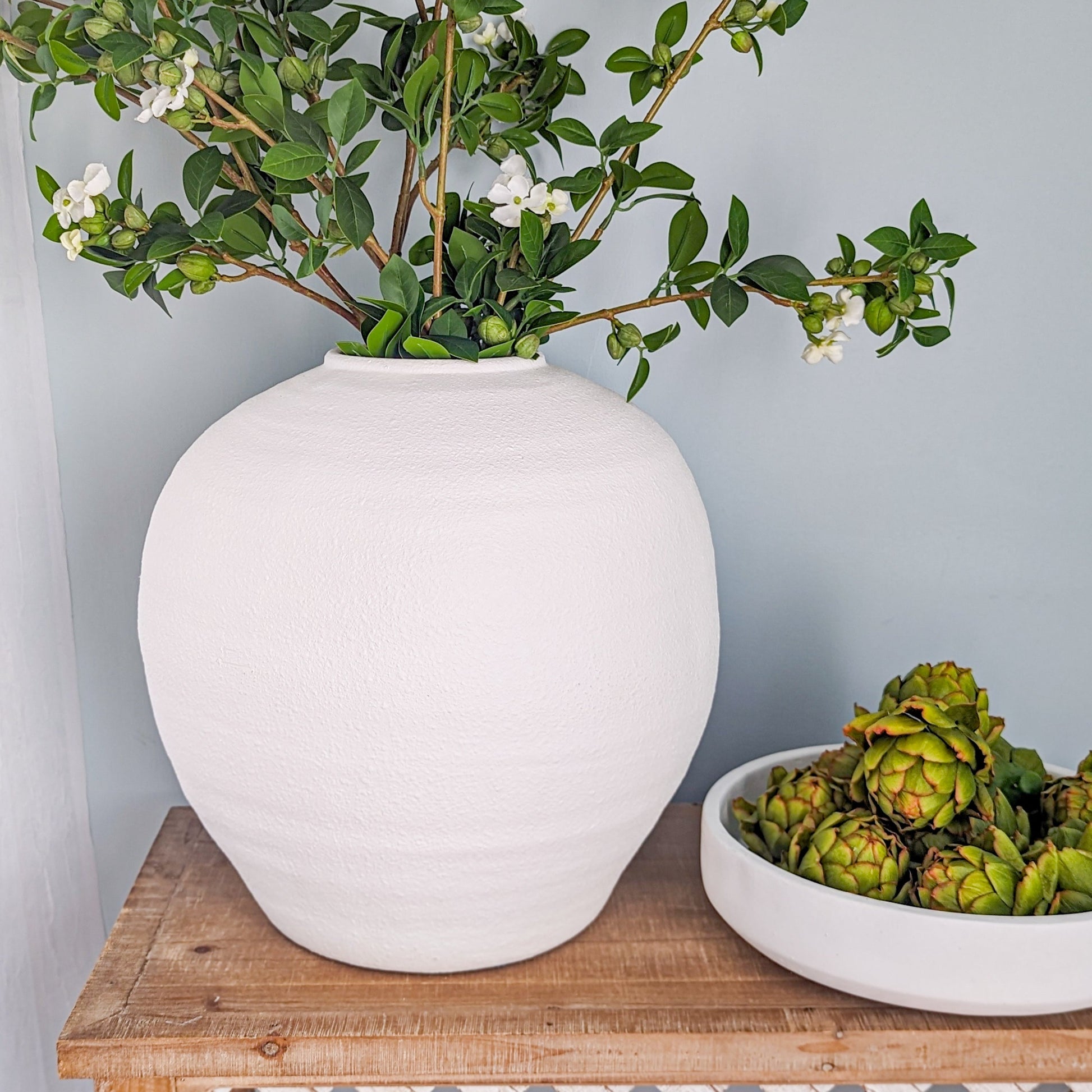 Round bellied vase in textural white is a beautiful statement piece alone. Its size and shape provide a perfect canvas for a large arrangement, potted plant, or dried stems.