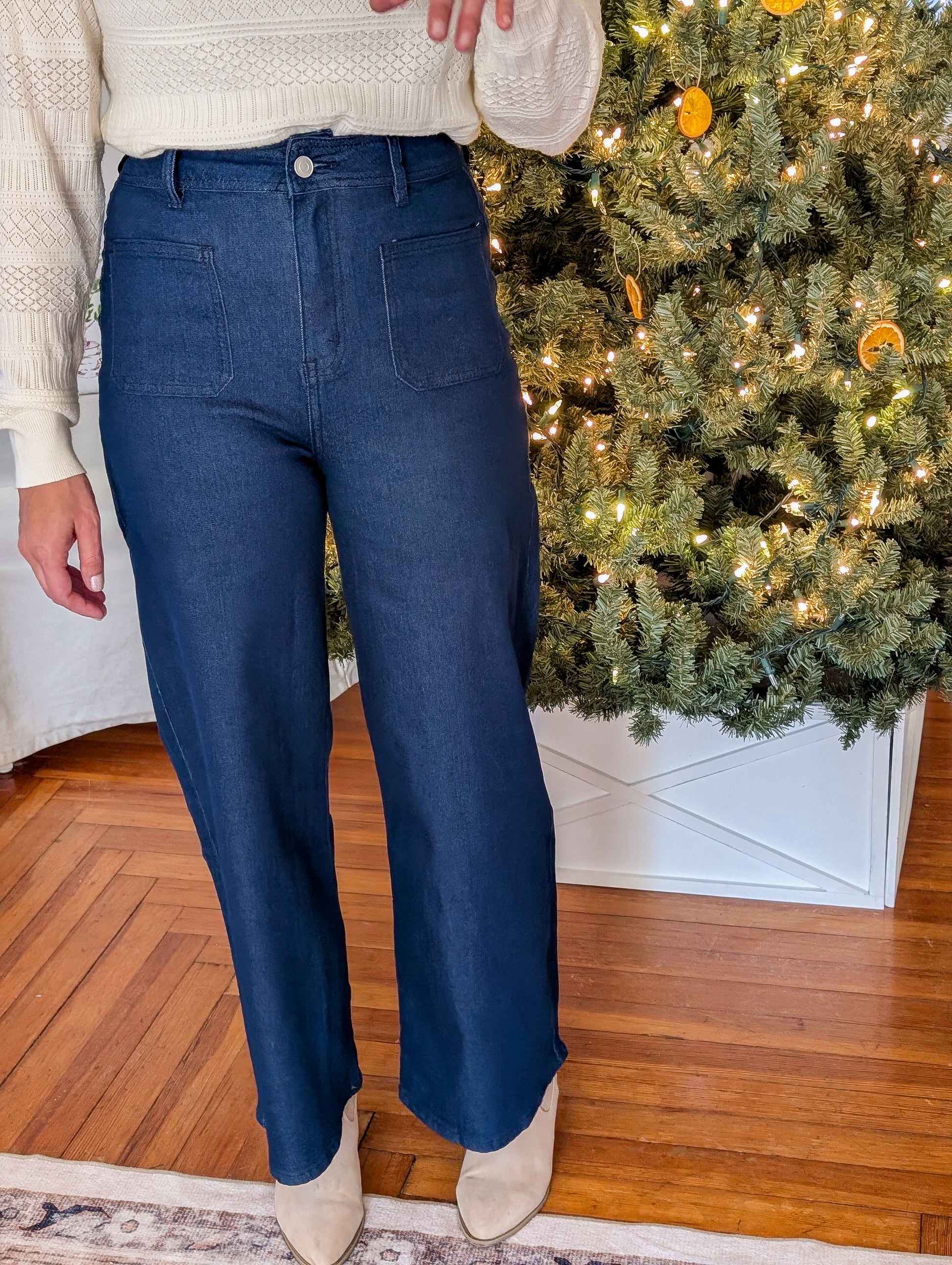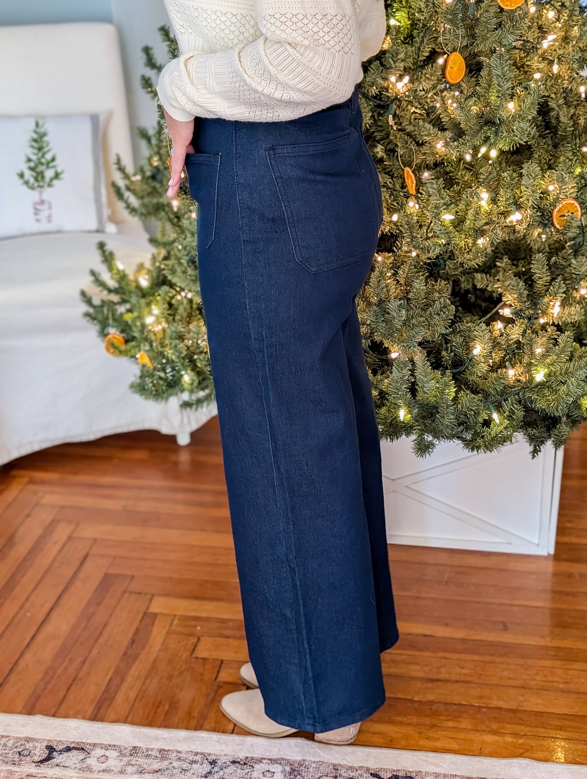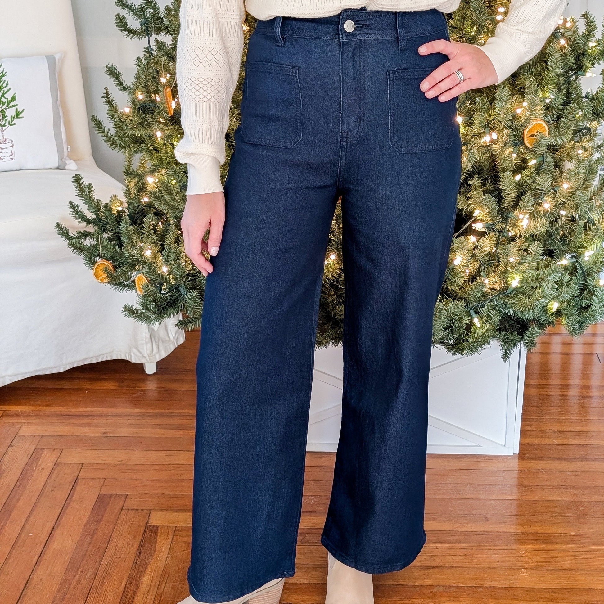 Crafted from soft denim knit fabric, these high-waisted jeans offer the perfect blend of comfort and flexibility. The straight wide-leg fit enhances the silhouette, adding a stylish edge that makes them versatile for any occasion. With front and back patch pockets for a touch of utility and a zip fly with button closure for a secure fit, these jeans are both practical and chic. Pair them with a fitted top or an oversized sweater for a look that’s effortlessly on-trend—an essential addition to any wardrobe.